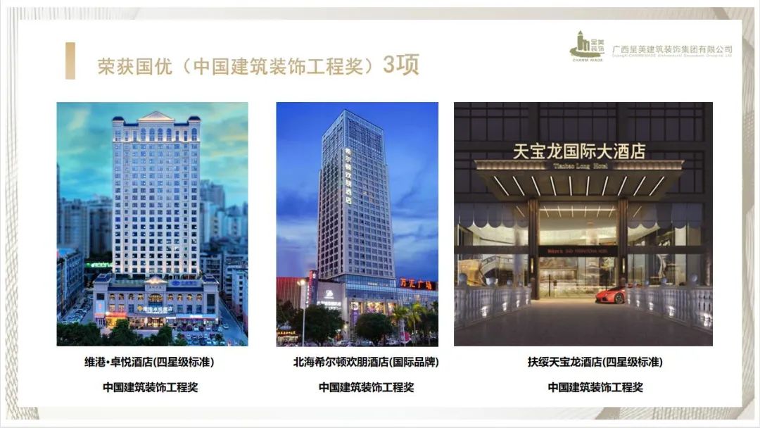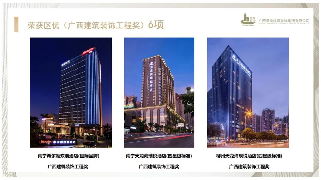 呈美建筑裝飾集團(tuán)在廣西酒店裝飾裝修行業(yè)中傲立前端,其中3個(gè)酒店裝飾裝修項(xiàng)目榮獲中國建筑裝飾工程獎(jiǎng)、6個(gè)酒店裝飾裝修項(xiàng)目榮獲廣西建筑裝飾工程獎(jiǎng)。